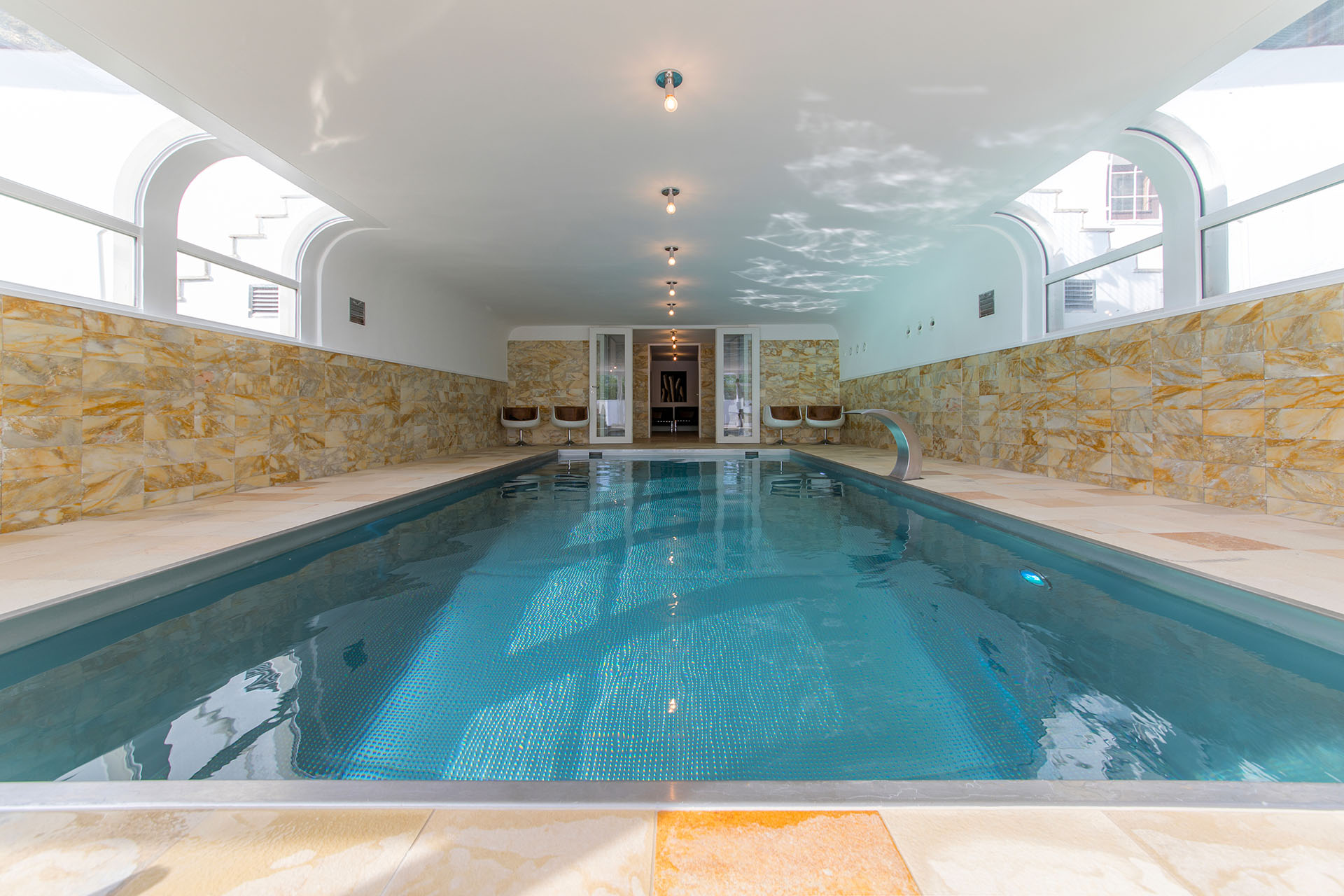 Im Inneren setzt sich die Architektur der Extraklasse fort: Das Herzstück des Hauses bildet ein tieferliegender Wohnraum mit offenem Kamin, umgeben von einer Galerie und überstrahlt von einer Lichtkuppel, die das Tageslicht großzügig in die Räume fließen lässt. Mahagoniholz, Solnhofener Kalkstein und Onyxmarmor prägen die Oberflächen – ein raffinierter Mix, der die noblen Materialien in einzigartiger Harmonie vereint.