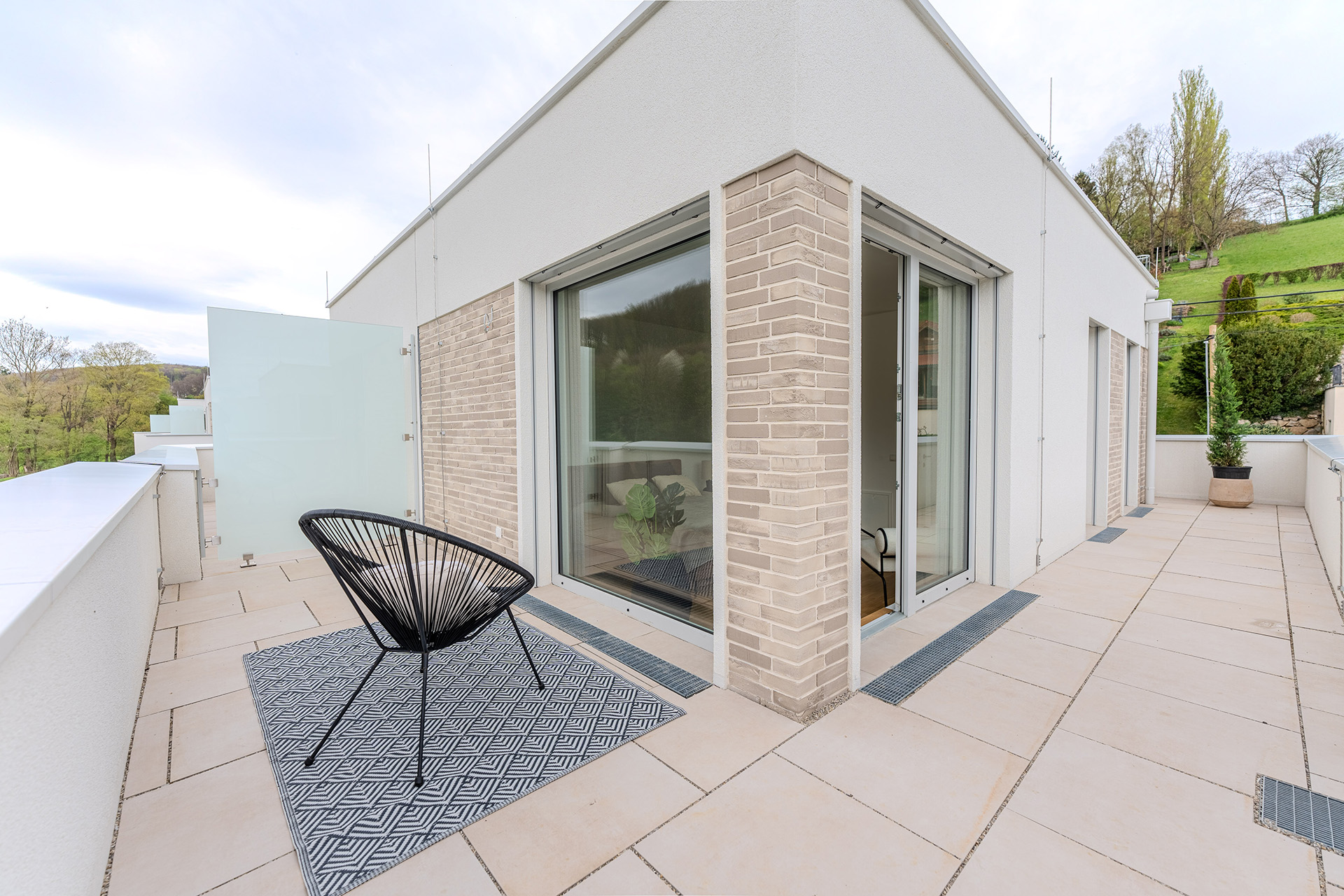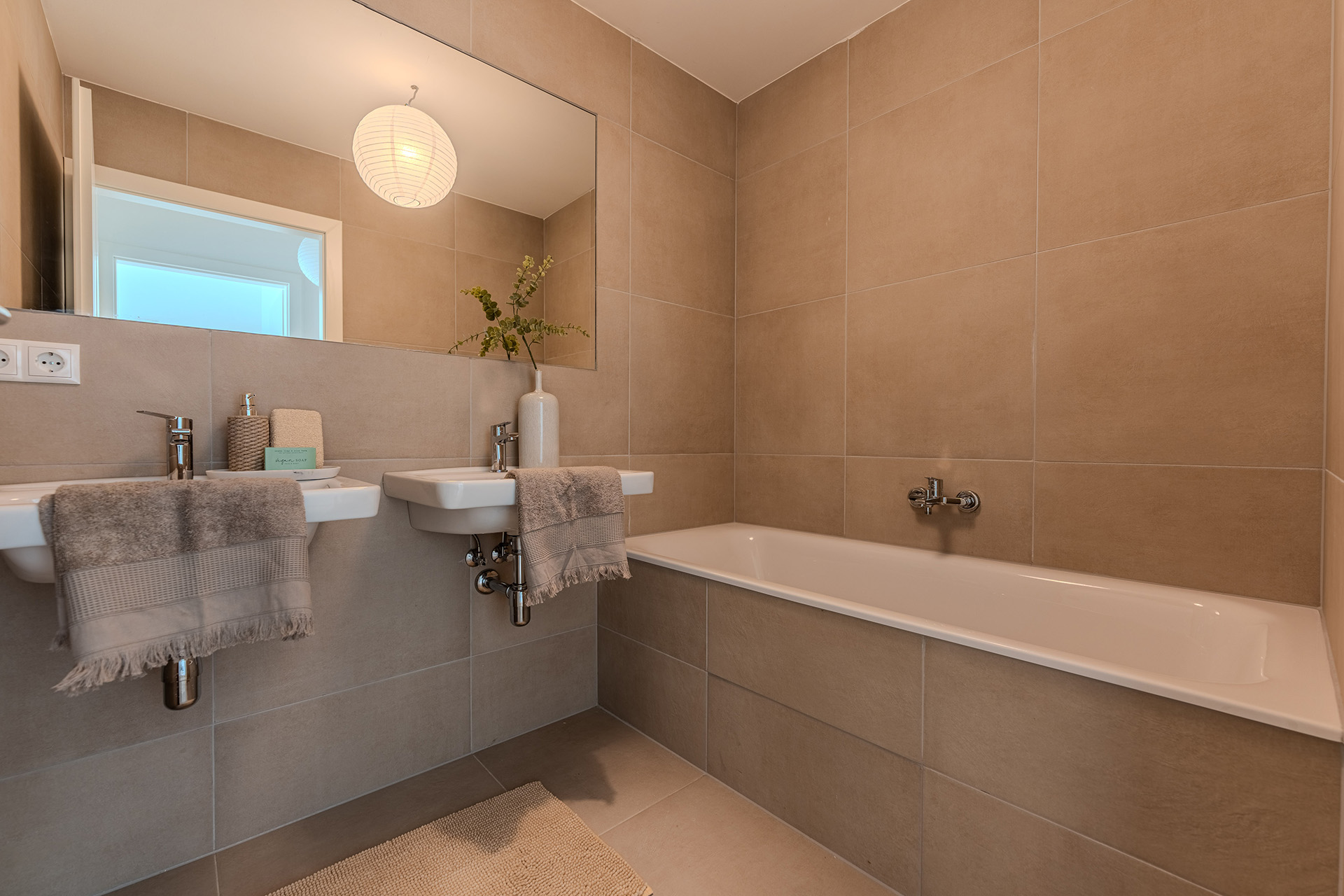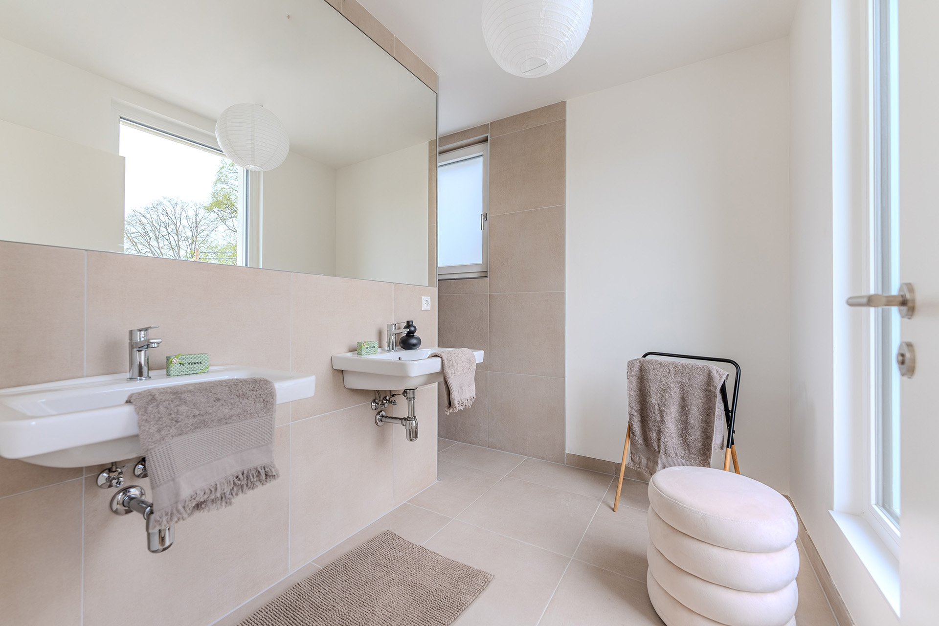 - Großformatiges Feinsteinzeug in den Sanitärräumen