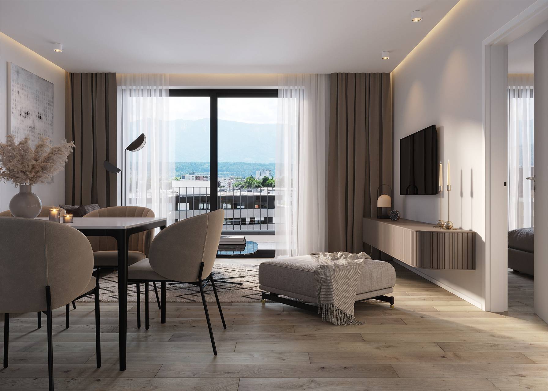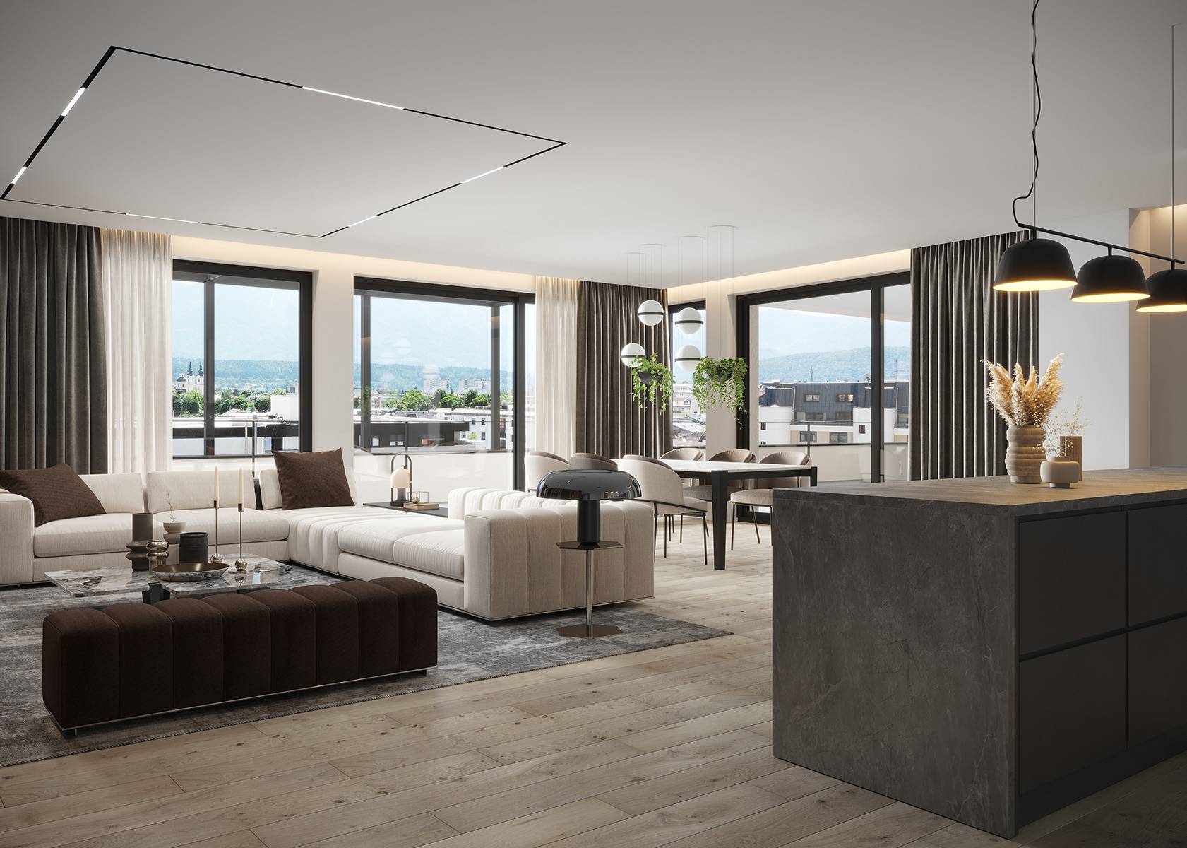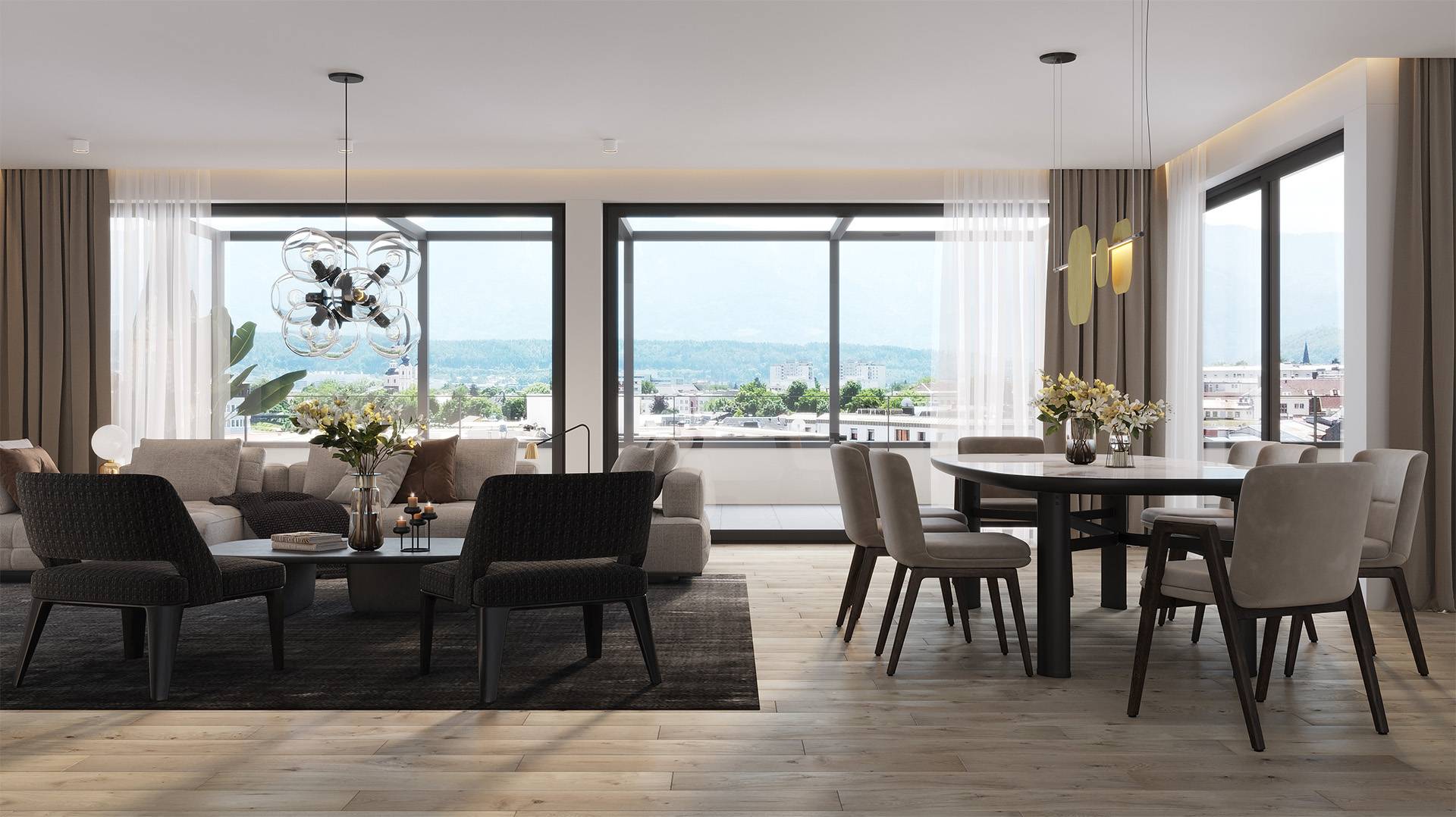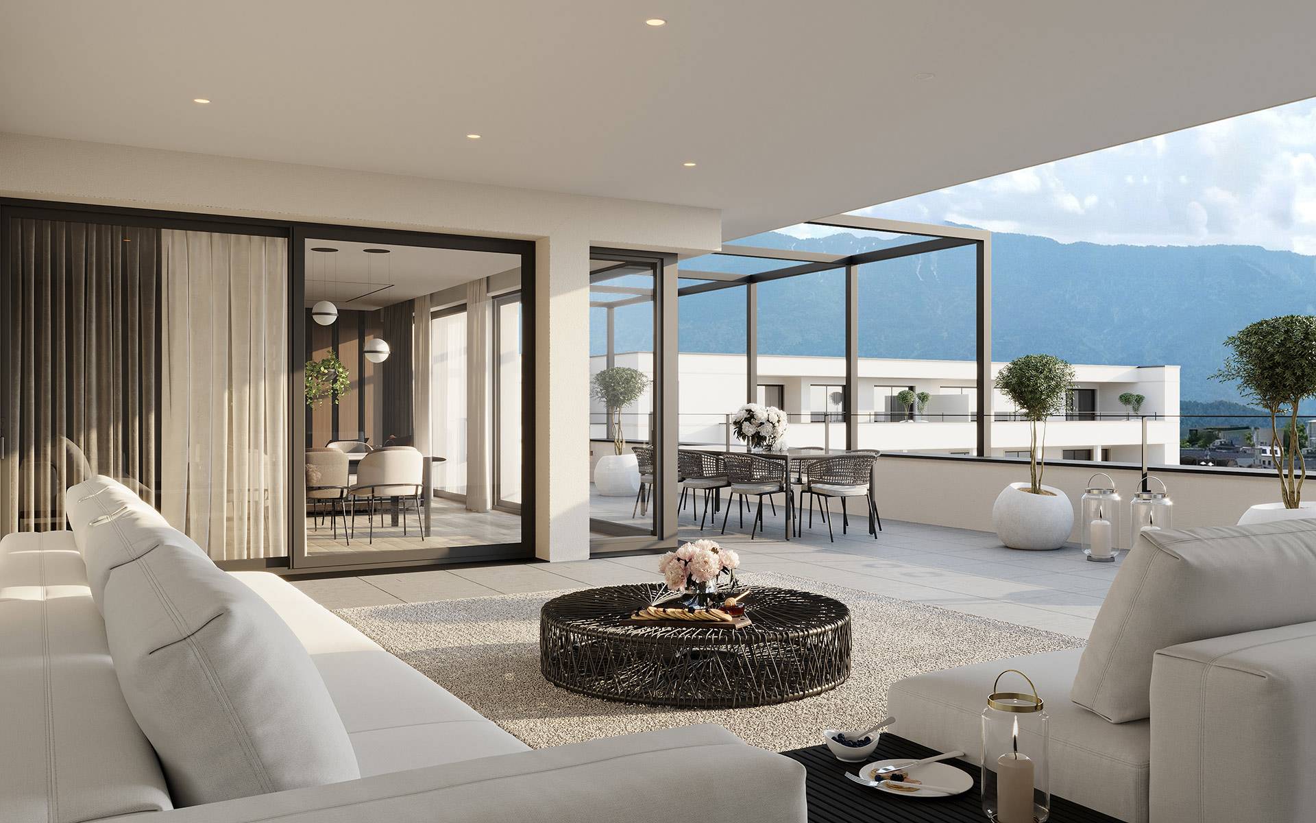 Alle Penthäuser bieten ein herrliches Panorama sowohl von den großen Terrassen als auch von den Zimmern, durch die großen Fensterflächen. Modernste Heiz- und Kühltechnik sorgt für ein angenehmes Wohnklima im ganzen Jahr.