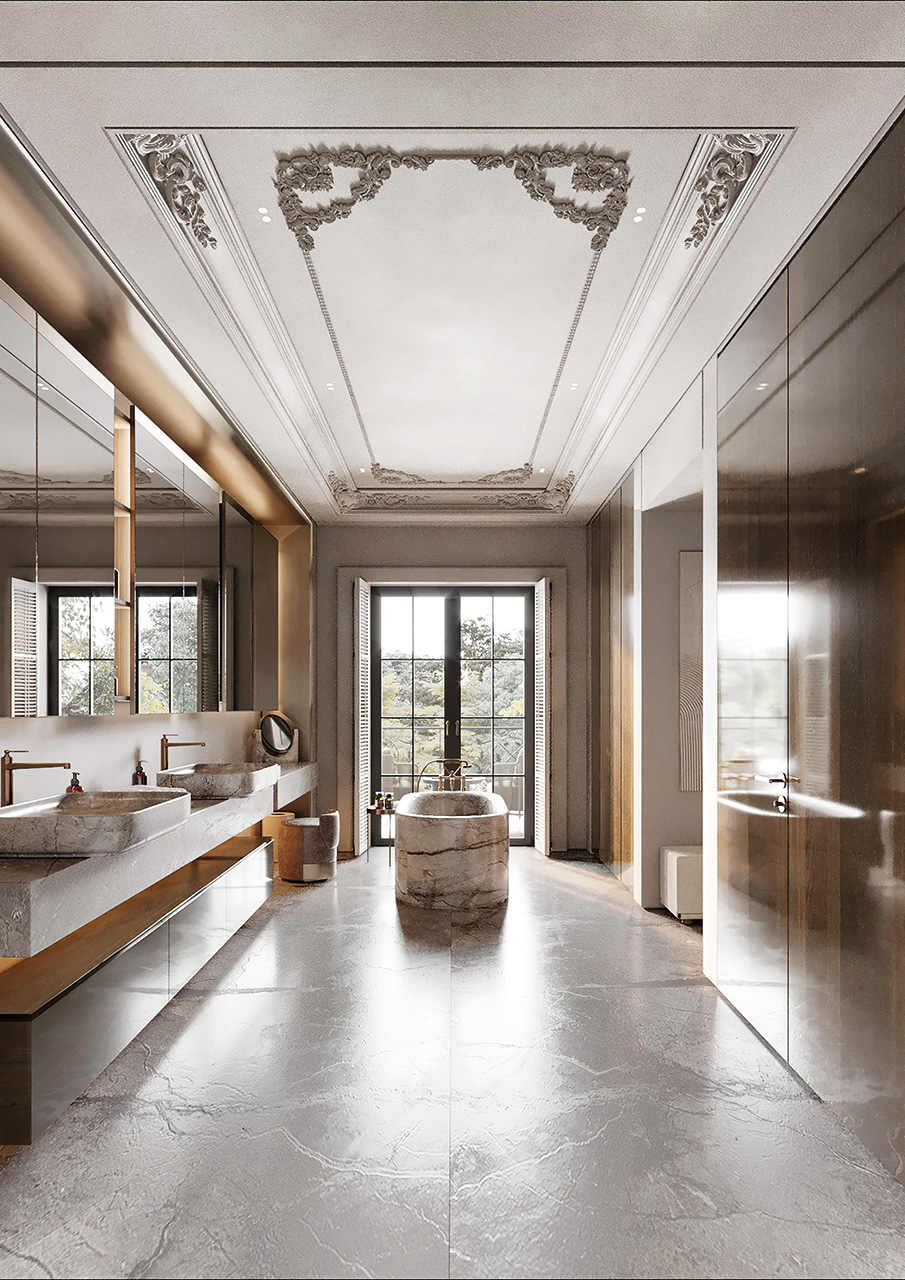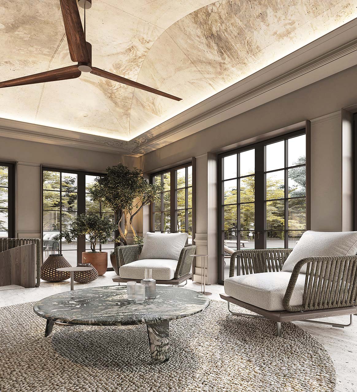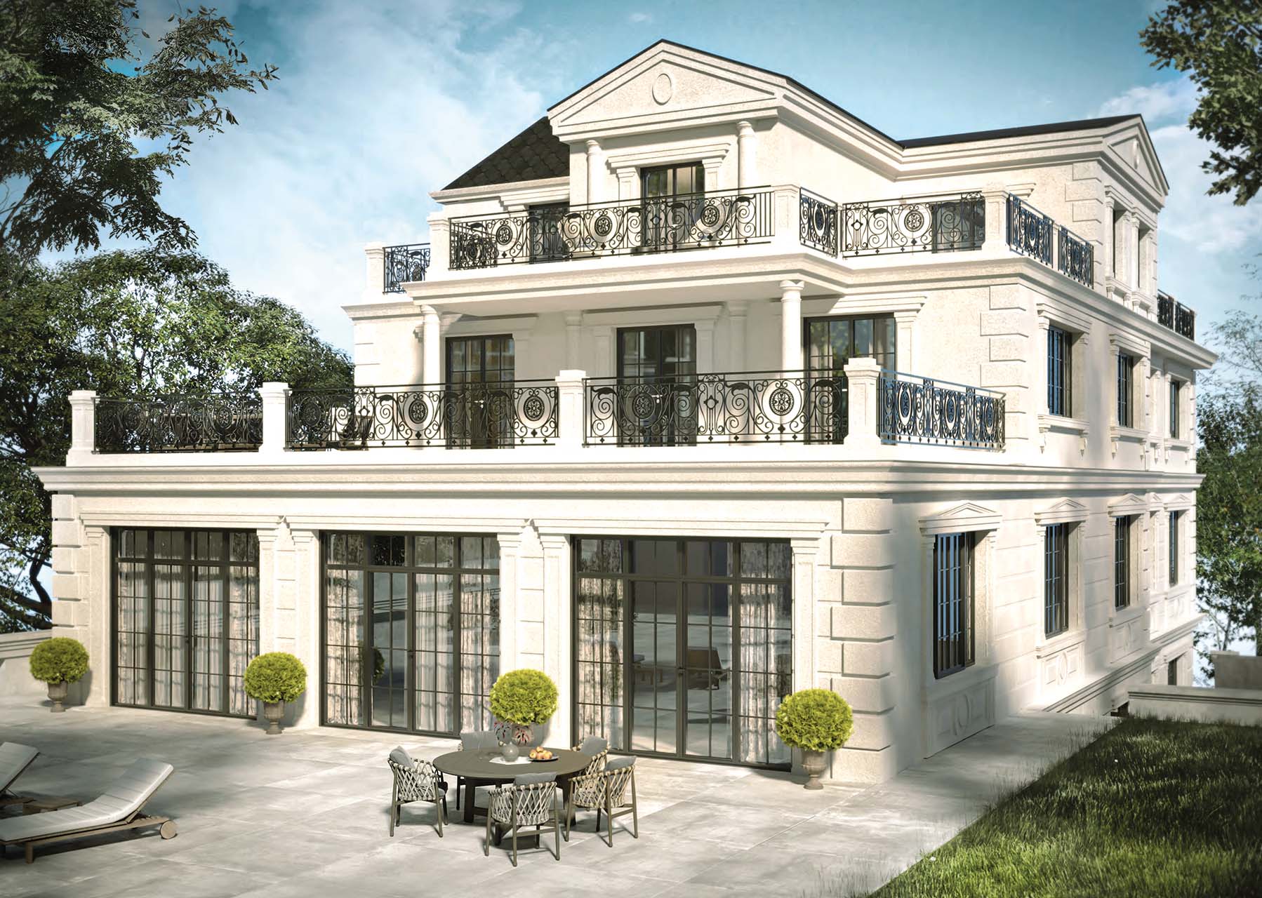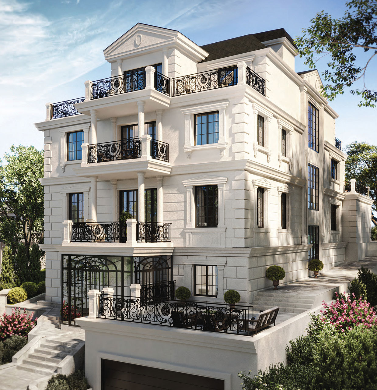 Bereits der erste Blick auf dieses von klassischer europäischer Villenarchitektur aus dem 19. Jahrhundert inspirierte Meisterwerk bleibt in Erinnerung. Die in Handarbeit ausgeführte, neoklassizistische Fassadengestaltung und die Verwendung hochwertigster Materialien sowie kunstfertige Details vermitteln die Grandezza längst vergangener Tage.