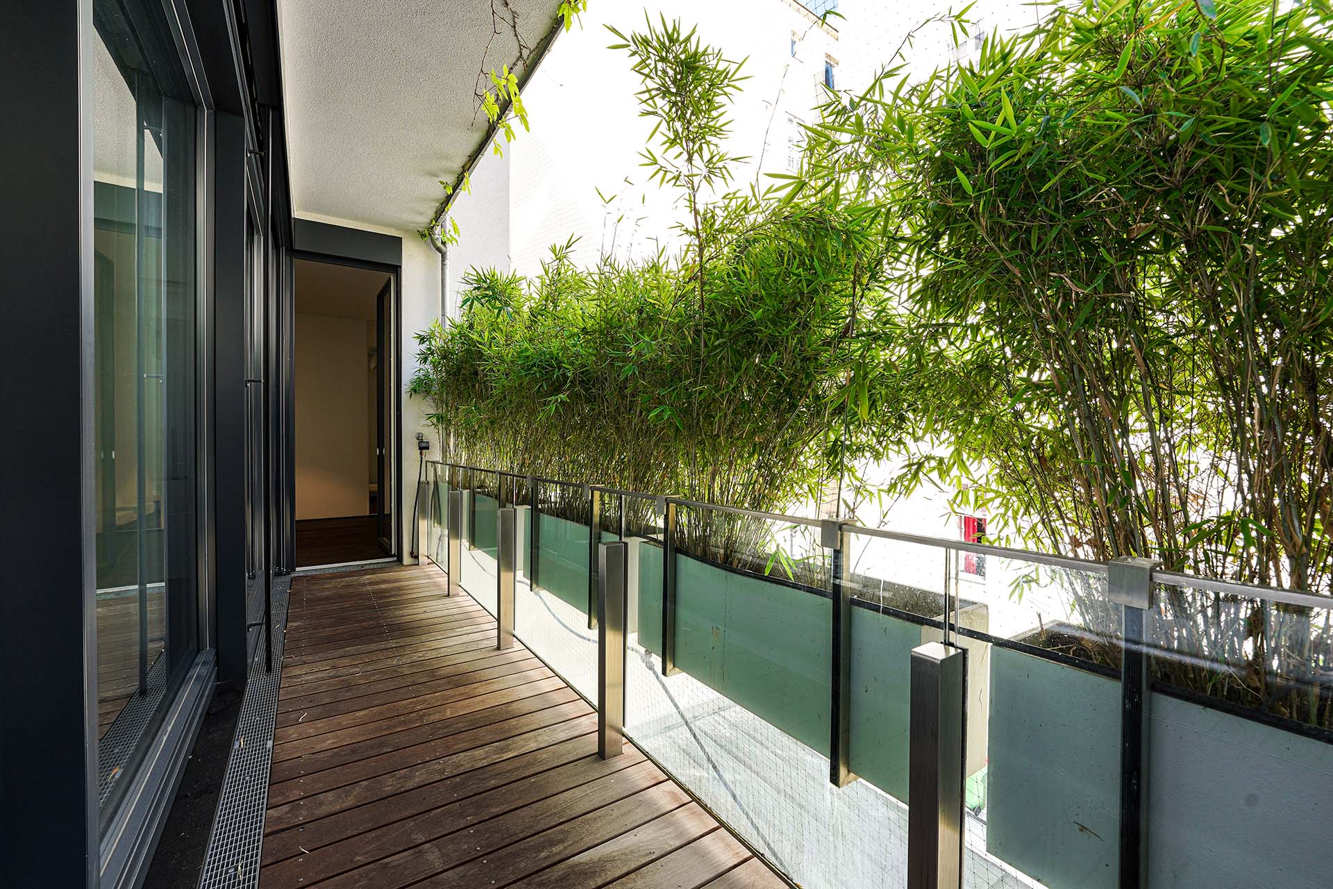 Hochwertige Materialien, wie der edle dunkle Eichenboden und die stilvollen Einbauschränke vom Tischler, verleihen den Räumen eine warme und einladende Atmosphäre. Die ca. 8 m² große, begrünte Loggia ist der ideale Ort, um den Tag entspannt ausklingen zu lassen. Mit Außenjalousien an den Fenstern genießen Sie zudem Privatsphäre und Schutz vor der Sonne. Die Wohnung ist vollständig klimatisiert und barrierefrei zugänglich. Ein Personenaufzug bringt Sie bequem in den zweiten Stock. Ein privates Kellerabteil sorgt für zusätzlichen Stauraum.