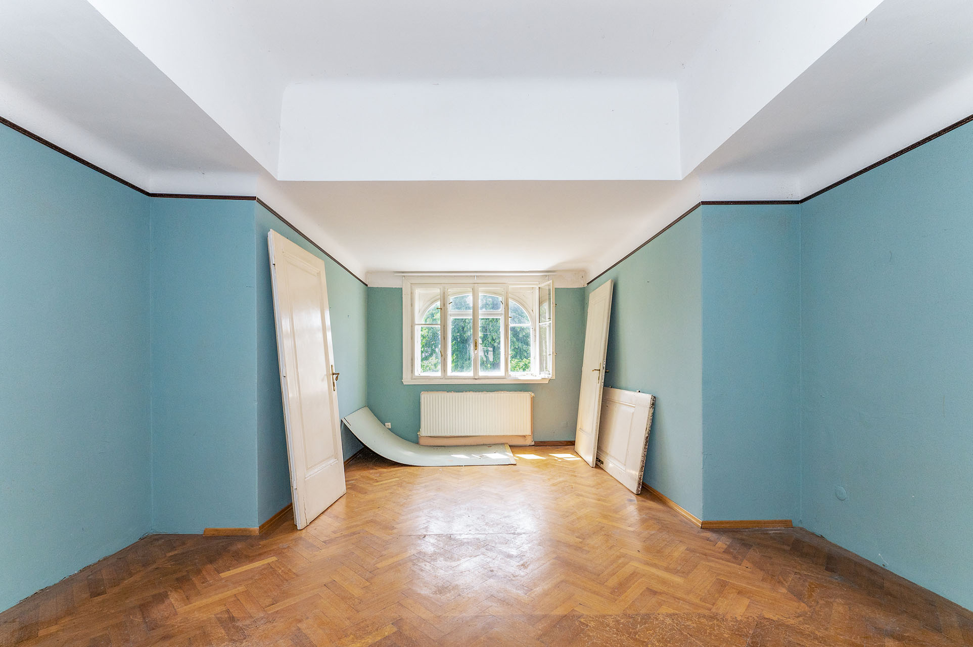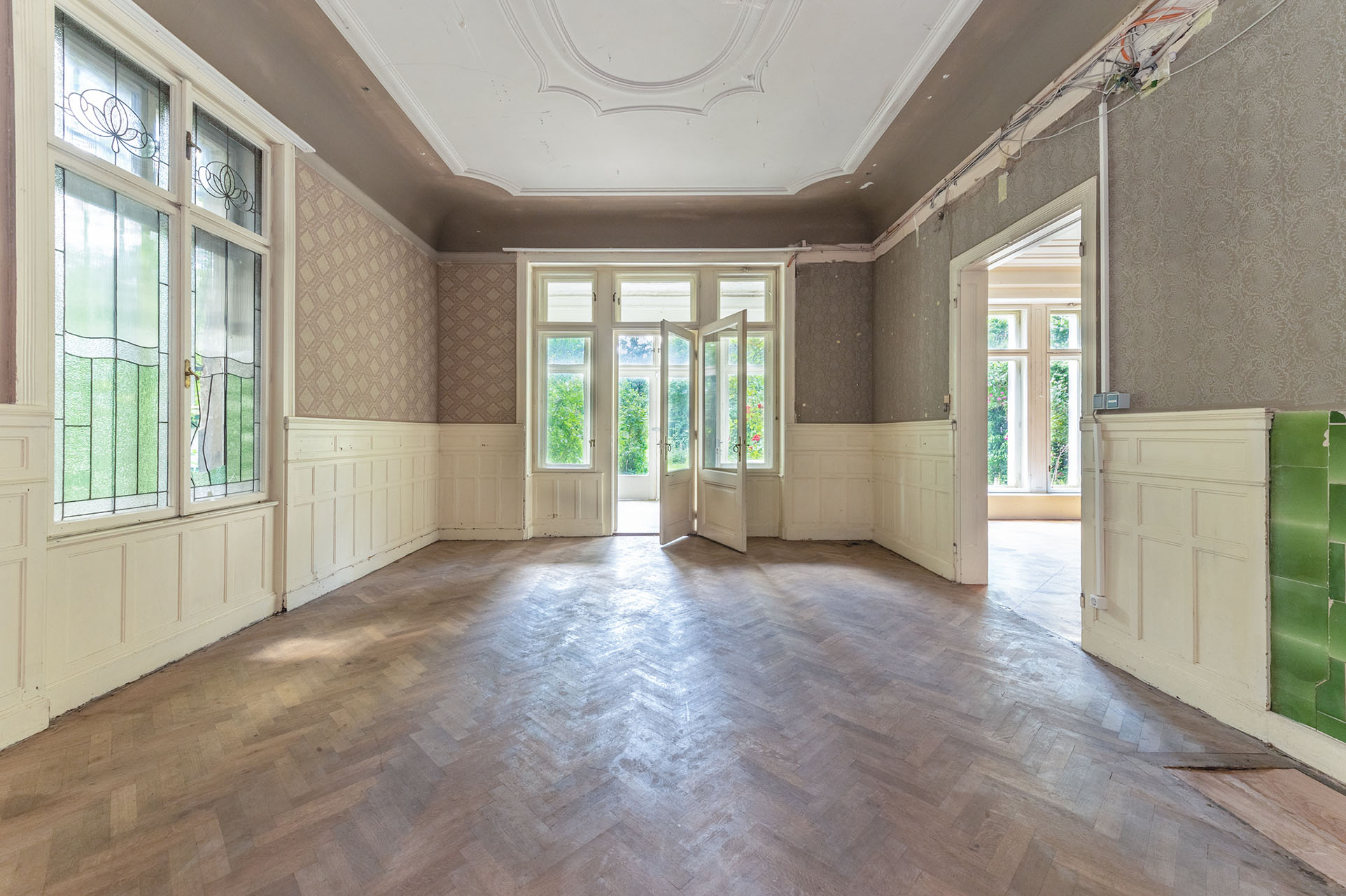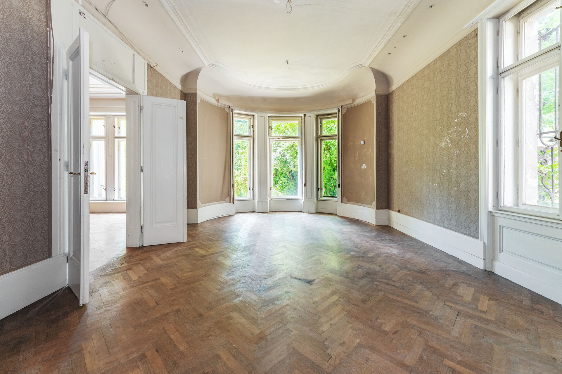 Die äußere Optik der Villa soll nach dem Original wiederhergestellt werden. Sämtliche metallischen Bauteile, wie Einfriedung und Eingangsportal, können saniert und im originalen Grünton beschichtet werden. Die Umbau- und Renovierungsmaßnahmen werden vor allem in dem ca. 933 m² großen Innenwohnbereichen gesetzt. Der beeindruckende Eingangsbereich sowie die großen, hohen und hellen Räume machen das Palais zu einem Unikat.